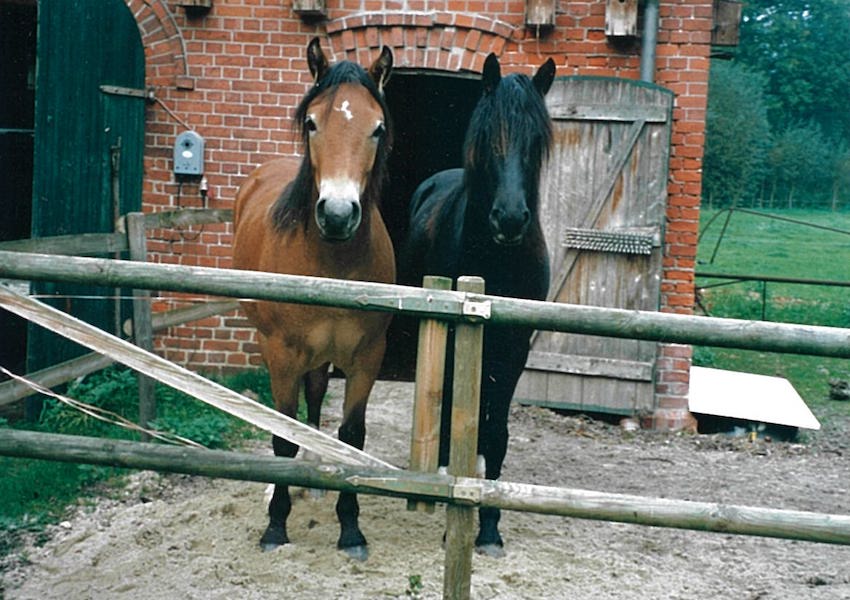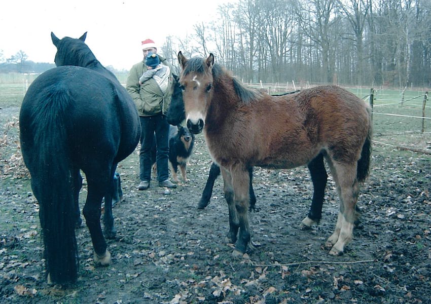 Jule gebar im Juni Freya, ich im Juli unseren Sohn Richard. Frieda, kam als Gesellschaftsfohlen dazu. Die Pferde stelle ich auf ihrer eigenen Seite genauer vor. Ich fing Stück für Stück an, das am Hund gelernte auf die Pferde umzusetzen. Katja und das Internet waren eine große Hilfe Neues auszuprobieren, zu lernen und sich auszutauschen. Meine Begeisterung für das Clickertraining wuchs mit jeder Trainingssession und als Katja mir sagte: „Also wenn du richtig gut werden willst, musst du zu Viviane Theby auf den Scheuerhof fahren und Hühnermodule mitmachen“, war die Entscheidung schnell gefällt. Mit dem Clickern an sich hatten sich schon Welten aufgetan, jetzt waren es Universen!