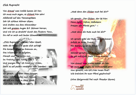 Not so very long ago punishment was common practise at Christmas, the feast of love. However, I strongly believe that the peoples’ attitude toward aversive measures will change to the better, and develop into a more humane way of living together. In the light of this belief and my deeply rooted, Schleswig-Holstein-born bond to Theodor Storm, I had huge fun re-writing his song of Knecht Ruprecht to reflect a similar transition in animal training. Enjoy!