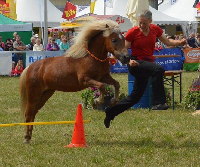 Of course a Shetty can live a good life with bigger ponies, but I wanted a buddy for Amadeus in 2014. My three mares have never been too keen to play. The internet didn’t bring any suitable results, but I heard about a Shetty gelding, who could not be touched and scratched himself severely on tail and mane. And looked very sweet indeed. So Wolfgang (2010) came to us. I was able to train him to accept human touch in no time at all, he responded very well to the clicker, but displayed fear and aggression. In my eyes, his main job was “be a good buddy for Amadeus”, and I limited his training to the husbandry routines. In 2017 I was forced to put my old mare Jule down, and on the very next day Wolfgang developed laminitis, as if he tried to say: “So, now it’s my turn”. Fortunately, he recovered relatively quickly, but was constantly struggling with his metabolism. Since my great veterinarian also offers constellation work for animals, we found out that Wolfgang deeply desired to have “something of his vown”. Triggered by another burst of liminitis, I started to train him on a regular basis. In this short time he transformed himself into a veritable True Horse Agility professional and enriched the training on the horse rockers with his beautiful levade. He never ceases to amaze me with his commitment.