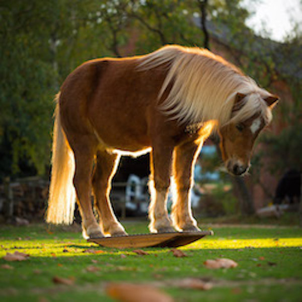 Since you cannot let a foal grow up alone among adults and my original plans with the mare of a friend had come to nothing, I urgently needed a second foal. So Frieda came to us, and her mother was picked up by the owner when she was 6 months old. Of course it was clear from the very first, that she would stay with us. I started her with a mixture of negative and positive reinforcement and, of course, I did a lot of clicker training with her. After we had moved to Ochtmannien I focused more and more on her, dreaming of informing the public about the great possibilities of clicker training. She developed a real talent for difficult balancing acts and grew into “Mrs. Body Awareness”, being able to balance on the narrowest and most shaky surfaces. Unfortunately then, luckily from today’s perspective, the trade shows and fairs were not for her. Luckily, because otherwise Freya would never have been able to show me her strengths. Today, she is my pride and joy as an Agi horse, and thrills my course participants with her enthusiastic motivation in training. She has also made many people feel the effects of the horse’s rockers and other therapy and training equipment, carrying them on her back.